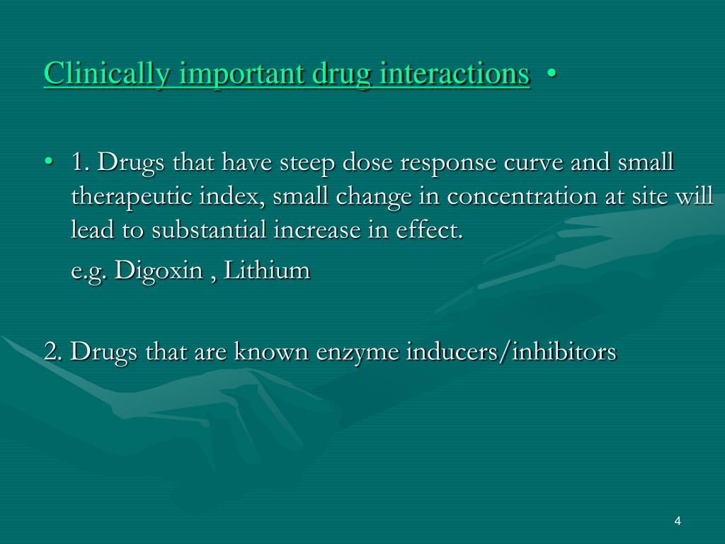 Clinically important drug interactions • 1. Drugs that have steep dose response curve and small therapeutic index, small change in concentration at site will lead to substantial increase in effect. e.g. Digoxin , Lithium 2. Drugs that are known enzyme inducers/inhibitors
