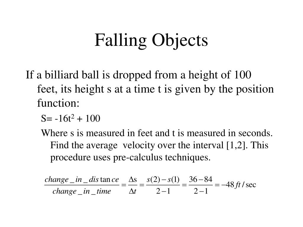 Falling Objects If a billiard ball is dropped from a height of 100 feet, its height s at a time t is given by the position function: S= -16t2 + 100 Where s is measured in feet and t is measured in seconds. Find the average velocity over the interval [1,2]. This procedure uses pre-calculus techniques.
