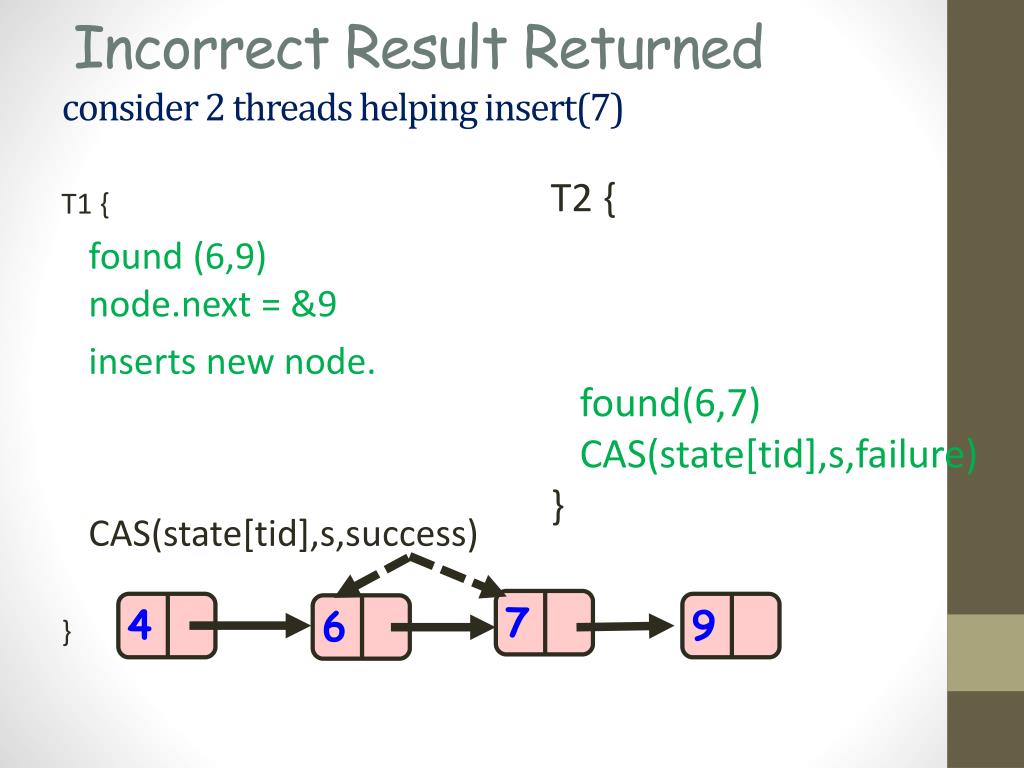 4 6 9 7 Incorrect Result Returnedconsider 2 threads helping insert(7) T2 { found(6,7) CAS(state[tid],s,failure) } T1 { found (6,9)node.next = &9 inserts new node CAS(state[tid],s,success) }