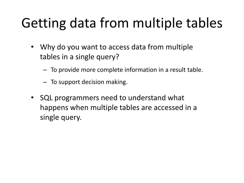 Getting data from multiple tables • Why do you want to access data from multiple tables in a single query? • To provide more complete information in a result table. • To support decision making. • SQL programmers need to understand what happens when multiple tables are accessed in a single query.