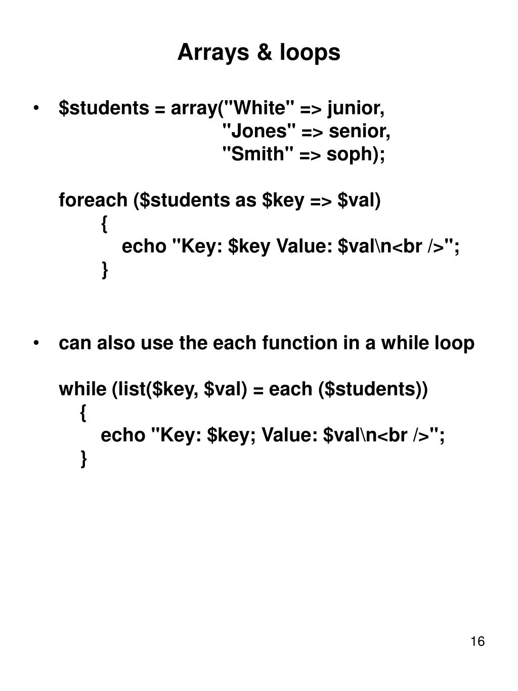 Arrays & loops • $students = array("White" => junior, "Jones" => senior, "Smith" => soph);foreach ($students as $key => $val) { echo "Key: $key Value: $val\n<br />"; } • can also use the each function in a while loopwhile (list($key, $val) = each ($students)) { echo "Key: $key; Value: $val\n<br />"; }