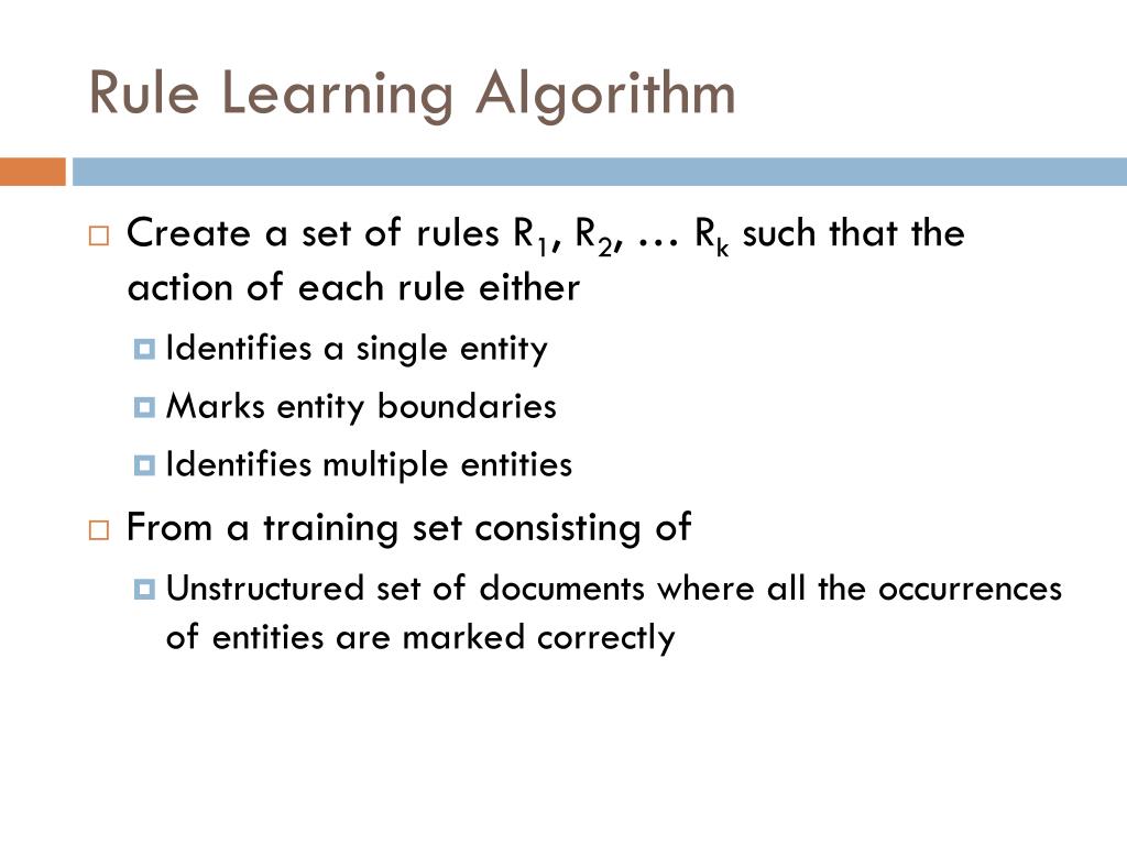Rule Learning Algorithm • Create a set of rules R1, R2, … Rk such that the action of each rule either • Identifies a single entity • Marks entity boundaries • Identifies multiple entities • From a training set consisting of • Unstructured set of documents where all the occurrences of entities are marked correctly