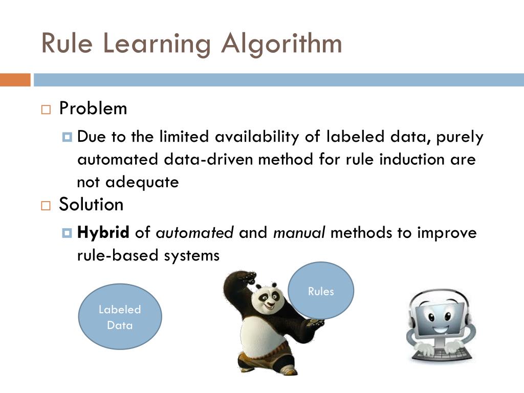 Rule Learning Algorithm • Problem • Due to the limited availability of labeled data, purely automated data-driven method for rule induction are not adequate • Solution • Hybrid of automated and manual methods to improve rule-based systems Rules Labeled Data