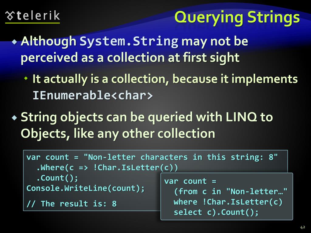 Querying Strings • Although System.Stringmay not be perceived as a collection at first sight • It actually is a collection, because it implements IEnumerable<char> • String objects can be queried with LINQ to Objects, like any other collection var count ="Non-letter characters in this string: 8" .Where(c => !Char.IsLetter(c)) .Count(); Console.WriteLine(count); //The result is: 8 var count = (from c in "Non-letter…" where !Char.IsLetter(c) select c).Count();