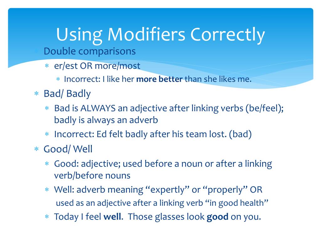 Using Modifiers Correctly • Double comparisons • er/est OR more/most • Incorrect: I like her more better than she likes me. • Bad/ Badly • Bad is ALWAYS an adjective after linking verbs (be/feel); badly is always an adverb • Incorrect: Ed felt badly after his team lost. (bad) • Good/ Well • Good: adjective; used before a noun or after a linking verb/before nouns • Well: adverb meaning “expertly” or “properly” OR used as an adjective after a linking verb “in good health” • Today I feel well. Those glasses look good on you.