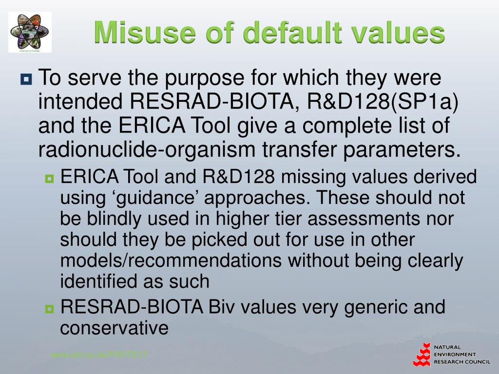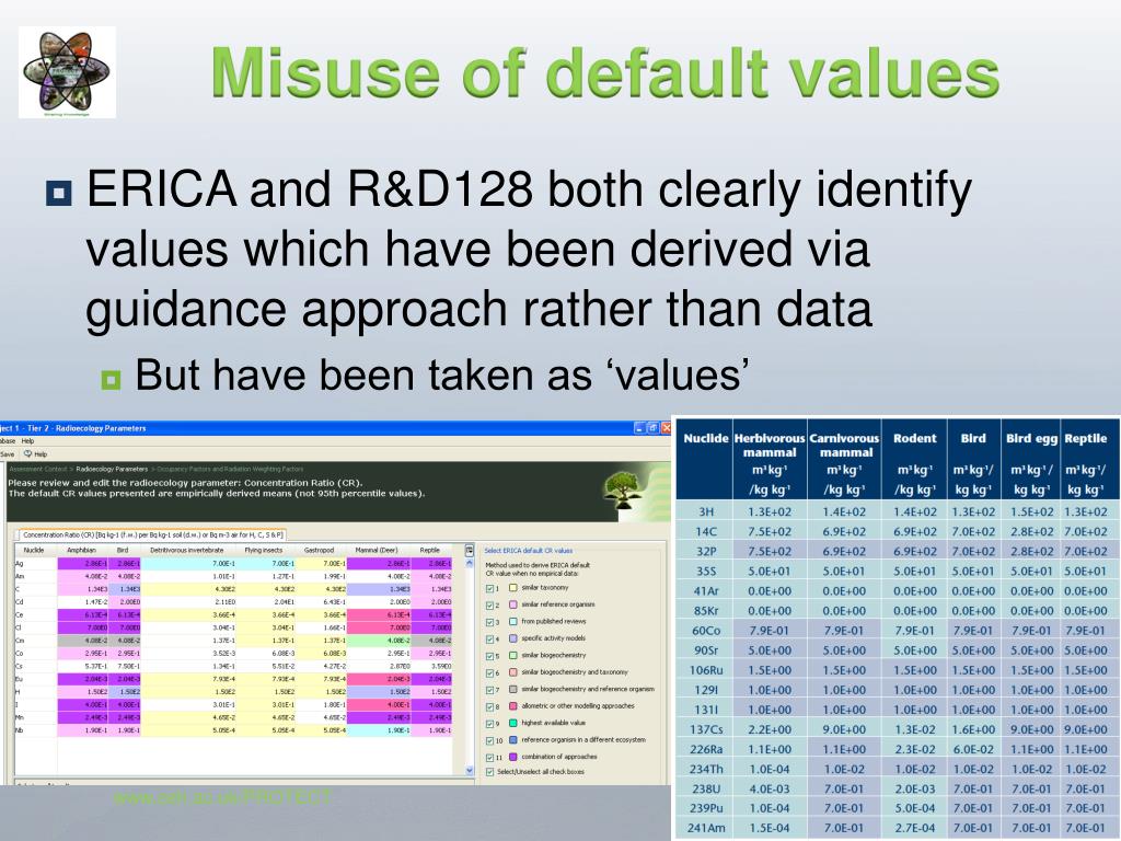 Misuse of default values • ERICA and R&D128 both clearly identify values which have been derived via guidance approach rather than data • But have been taken as ‘values’ www.ceh.ac.uk/PROTECT