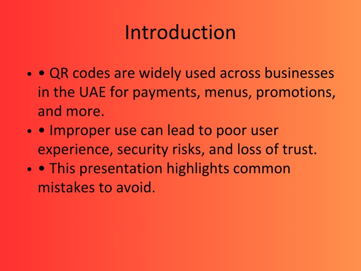 1. Introduction • QR codes are widely used across businesses in the UAE for payments, menus, promotions, and more. • Improper use can lead to poor user experience, security risks, and loss of trust. • This presentation highlights common mistakes to avoid.
