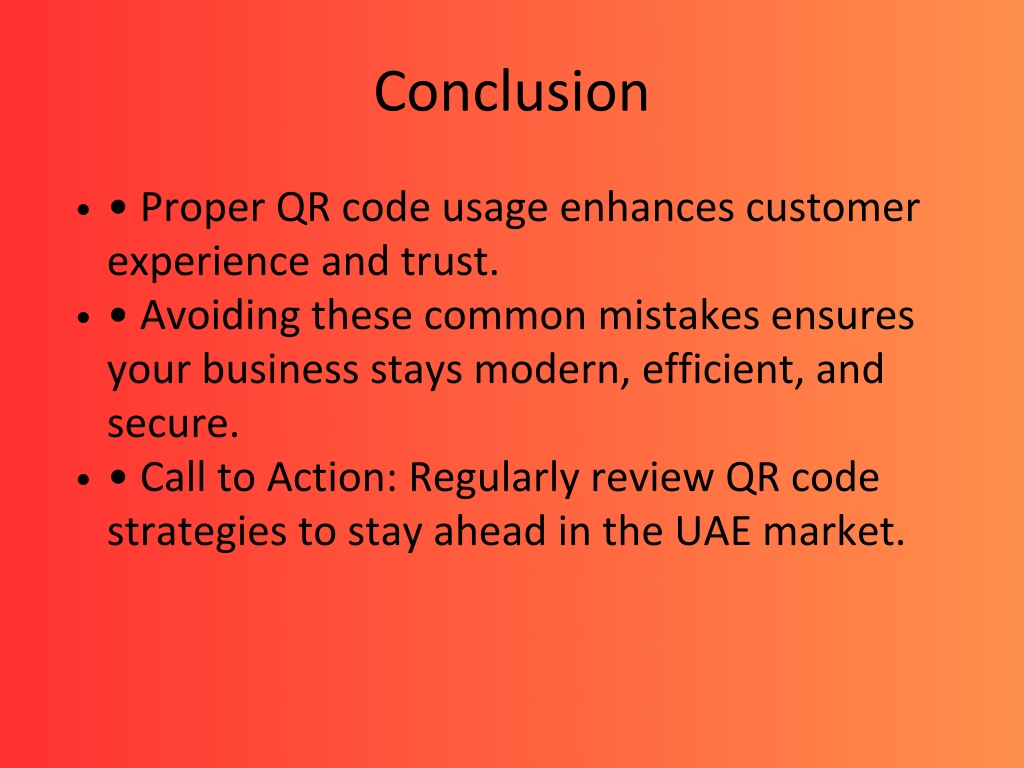 11. Conclusion • Proper QR code usage enhances customer experience and trust. • Avoiding these common mistakes ensures your business stays modern, efficient, and secure. • Call to Action: Regularly review QR code strategies to stay ahead in the UAE market.