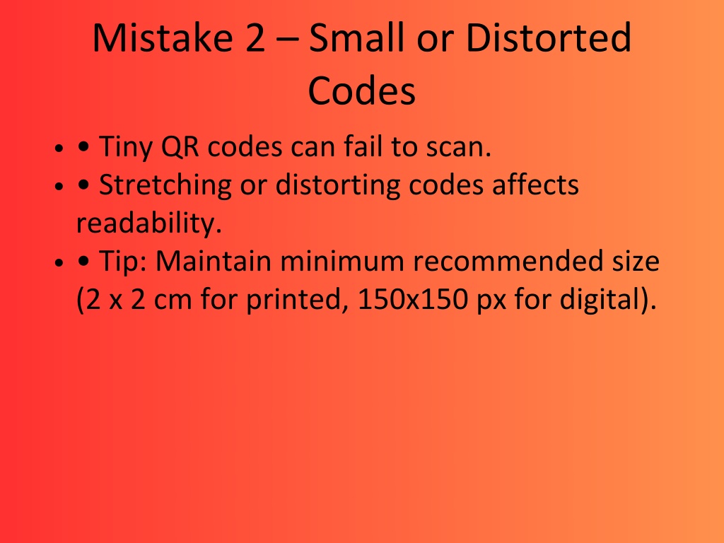 4. Mistake 2 – Small or Distorted Codes • Tiny QR codes can fail to scan. • Stretching or distorting codes affects readability. • Tip: Maintain minimum recommended size (2 x 2 cm for printed, 150x150 px for digital).