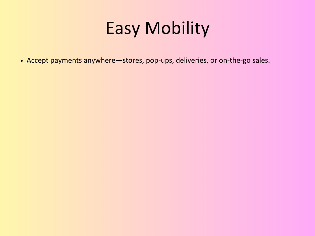 Easy Mobility Accept payments anywhere—stores, pop-ups, deliveries, or on-the-go sales.
