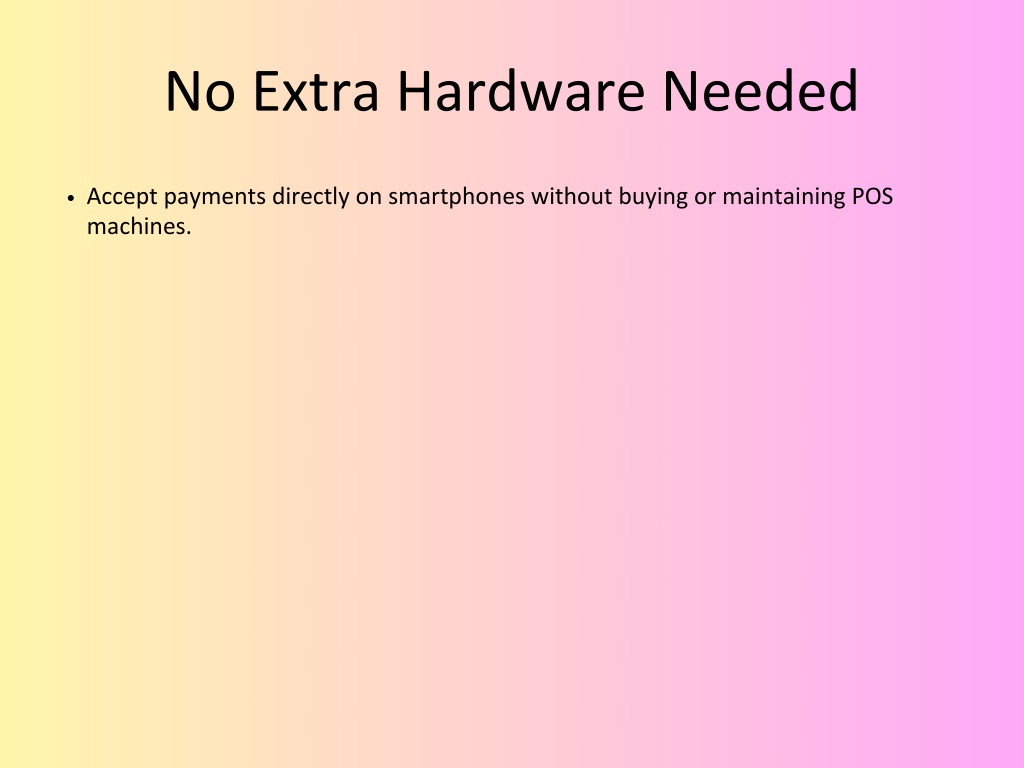 No Extra Hardware Needed Accept payments directly on smartphones without buying or maintaining POS machines.