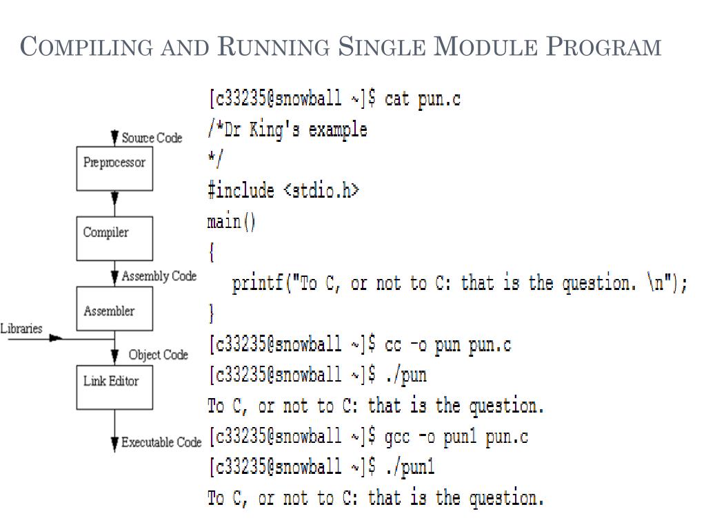 C Programming Tools. Compiling and Running Single Module Program. Some Compiler Options. $ gcc -c Just compile, don’t link $ gcc -E Just preprocess, print out source $ gcc -S Produce assembly code $ gcc -o <file> Save result into <file> $ gcc -I <path>
