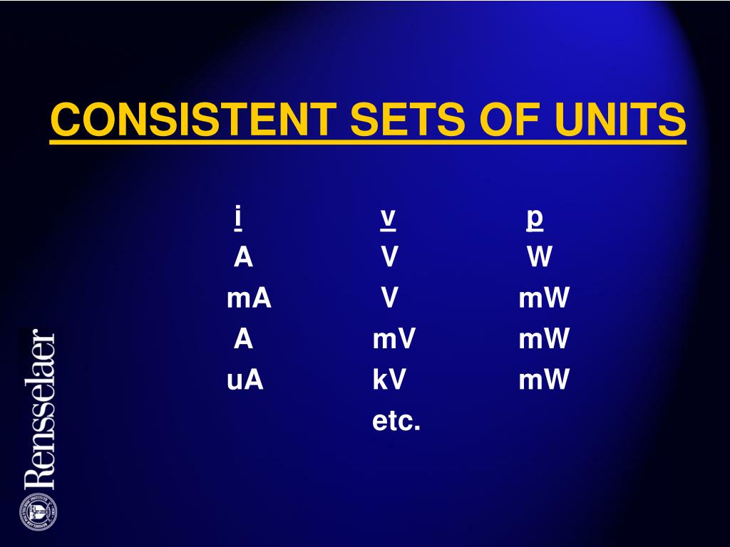 CONSISTENT SETS OF UNITS ivp A V W mA V mW A mV mW uA kV mW etc.