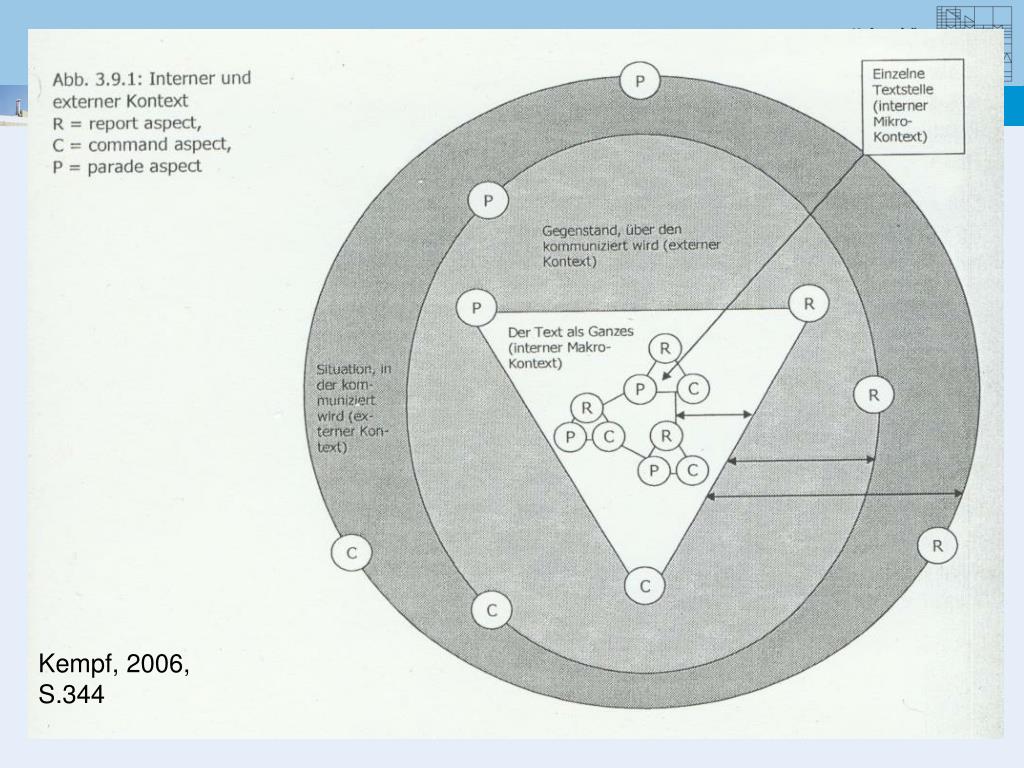 Textinterpretation Darstellungsfkt. Externer Kontext Ausdrucksfkt. Appellfunktion Gegenstand Situation R C P Funktionen Text Interner Kontext