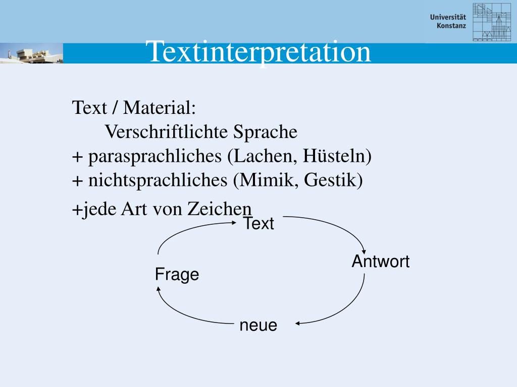 Text / Material: Verschriftlichte Sprache + parasprachliches (Lachen, Hüsteln)+ nichtsprachliches (Mimik, Gestik) +jede Art von Zeichen Textinterpretation Text Antwort Frage neue