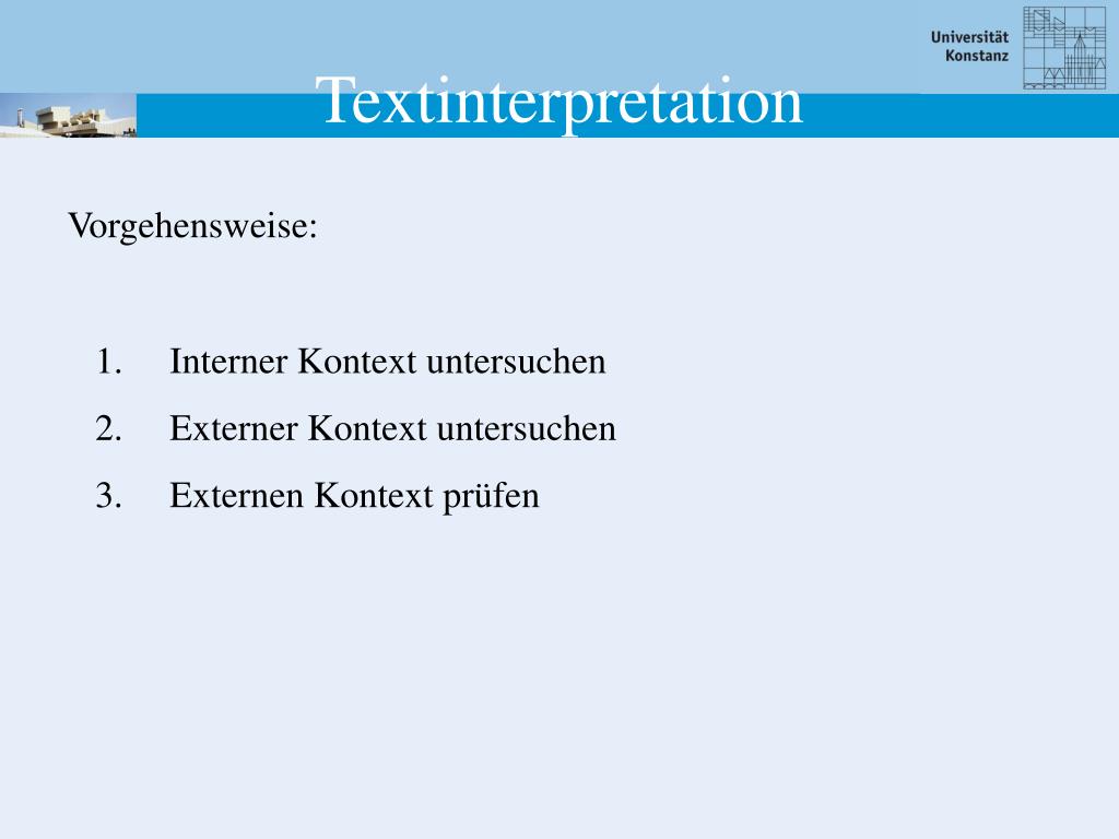 Vorgehensweise: Textinterpretation • Interner Kontext untersuchen • Externer Kontext untersuchen • Externen Kontext prüfen