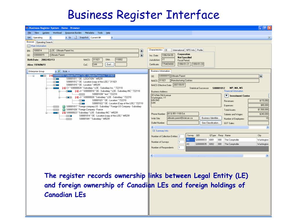 Business Register Interface The register records ownership links between Legal Entity (LE) and foreign ownership of Canadian LEs and foreign holdings of Canadian LEs