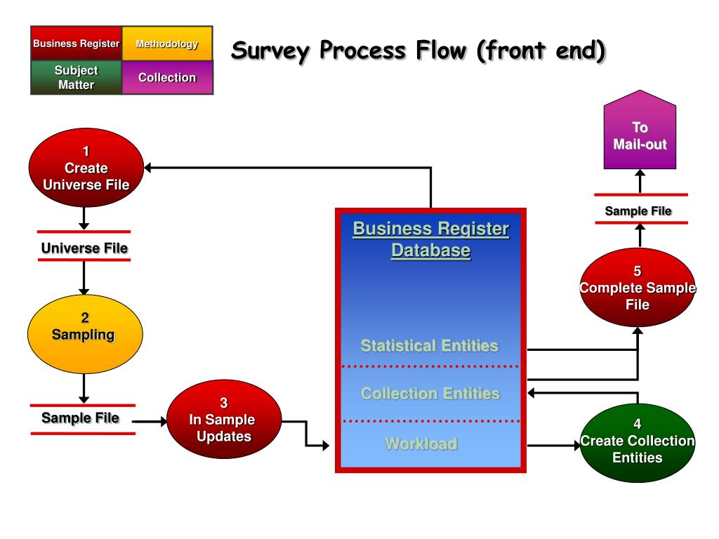 Business Register Methodology Survey Process Flow (front end) Subject Matter Collection To Mail-out 1 Create Universe File Sample File Business Register Database Universe File 5 Complete Sample File 2 Sampling Statistical Entities 3 In Sample Updates Collection Entities 4 Create Collection Entities Sample File Workload