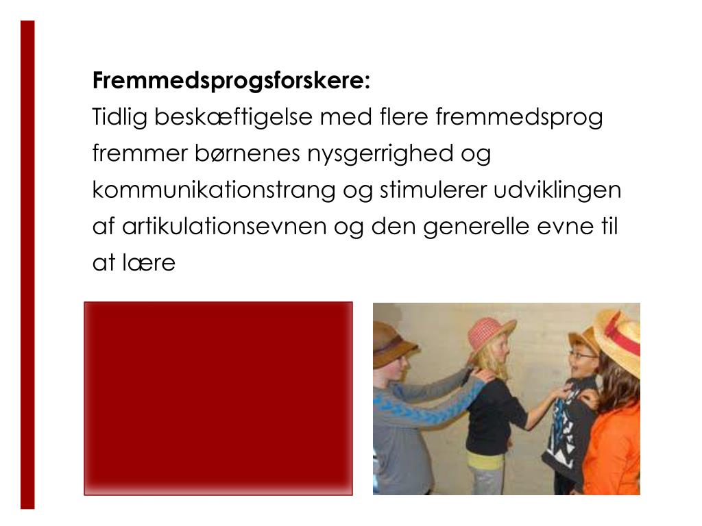 Fremmedsprogsforskere: • Tidlig beskæftigelse med flere fremmedsprog fremmer børnenes nysgerrighed og kommunikationstrang og stimulerer udviklingen af artikulationsevnen og den generelle evne til at lære