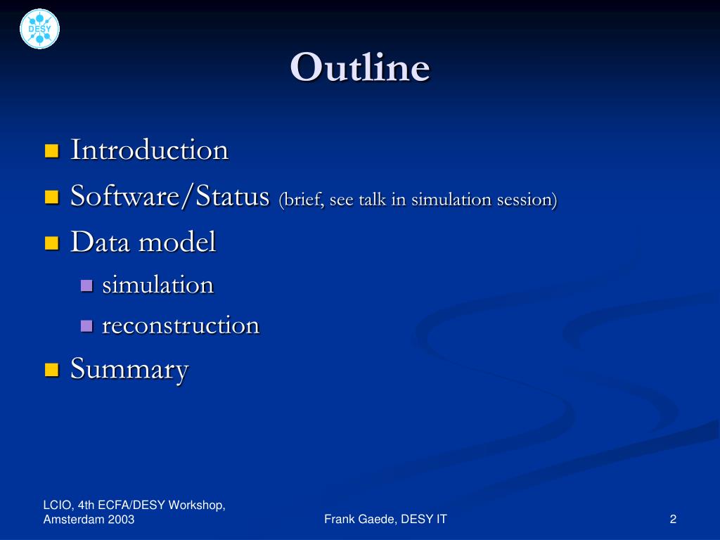 Outline • Introduction • Software/Status (brief, see talk in simulation session) • Data model • simulation • reconstruction • Summary Frank Gaede, DESY IT