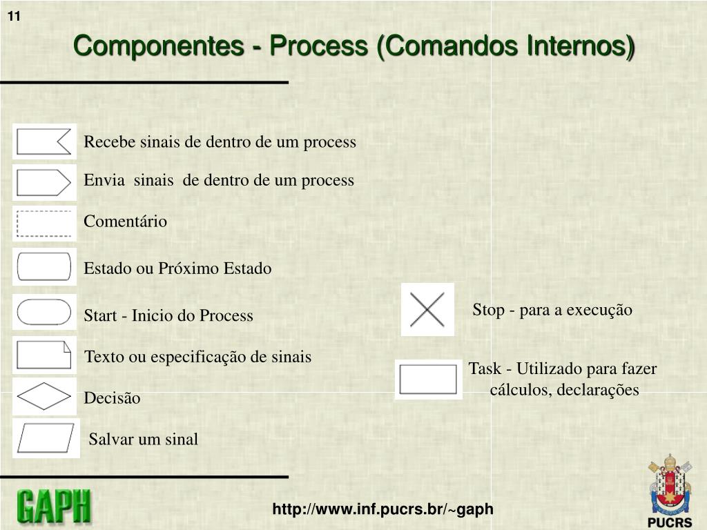 Componentes - Process (Comandos Internos) Recebe sinais de dentro de um process Envia sinais de dentro de um process Comentário Estado ou Próximo Estado Stop - para a execução Start - Inicio do Process Texto ou especificação de sinais Task - Utilizado para fazer cálculos, declarações Decisão Salvar um sinal