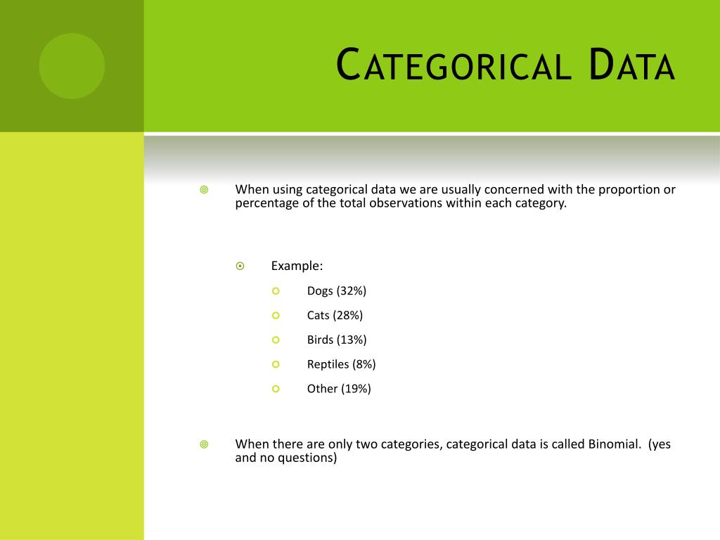 Categorical Data • When using categorical data we are usually concerned with the proportion or percentage of the total observations within each category. • Example: • Dogs (32%) • Cats (28%) • Birds (13%) • Reptiles (8%) • Other (19%) • When there are only two categories, categorical data is called Binomial. (yes and no questions)