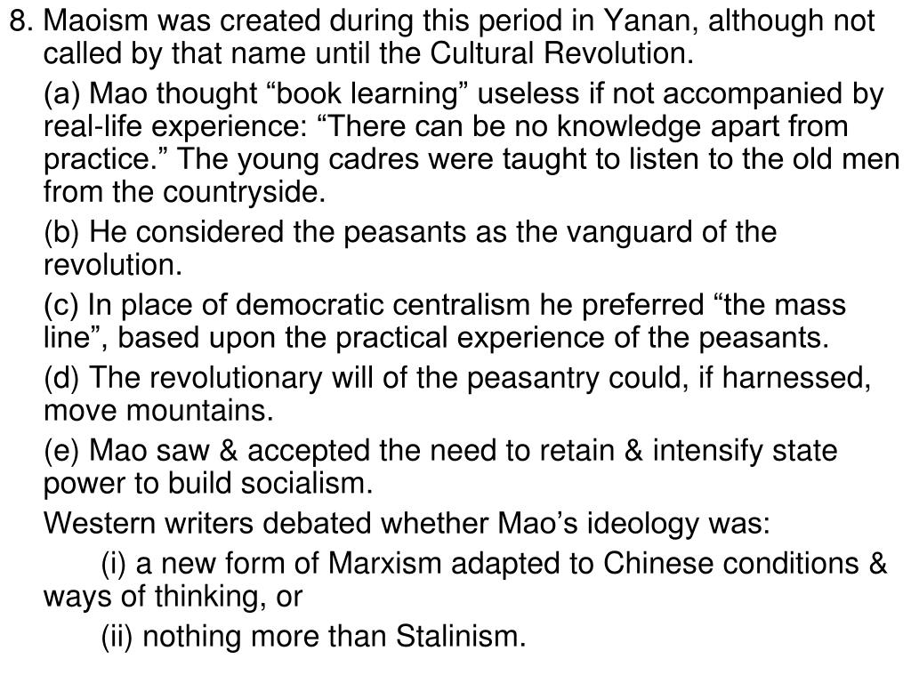 8. Maoism was created during this period in Yanan, although not called by that name until the Cultural Revolution. (a) Mao thought “book learning” useless if not accompanied by real-life experience: “There can be no knowledge apart from practice.” The young cadres were taught to listen to the old men from the countryside. (b) He considered the peasants as the vanguard of the revolution. (c) In place of democratic centralism he preferred “the mass line”, based upon the practical experience of the peasants. (d) The revolutionary will of the peasantry could, if harnessed, move mountains. (e) Mao saw & accepted the need to retain & intensify state power to build socialism. Western writers debated whether Mao’s ideology was: (i) a new form of Marxism adapted to Chinese conditions & ways of thinking, or (ii) nothing more than Stalinism.