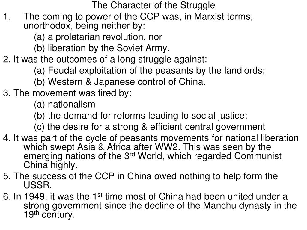 The Character of the Struggle • The coming to power of the CCP was, in Marxist terms, unorthodox, being neither by: (a) a proletarian revolution, nor (b) liberation by the Soviet Army. 2. It was the outcomes of a long struggle against: (a) Feudal exploitation of the peasants by the landlords; (b) Western & Japanese control of China. 3. The movement was fired by: (a) nationalism (b) the demand for reforms leading to social justice; (c) the desire for a strong & efficient central government 4. It was part of the cycle of peasants movements for national liberation which swept Asia & Africa after WW2. This was seen by the emerging nations of the 3rd World, which regarded Communist China highly. 5. The success of the CCP in China owed nothing to help form the USSR. 6. In 1949, it was the 1st time most of China had been united under a strong government since the decline of the Manchu dynasty in the 19th century.
