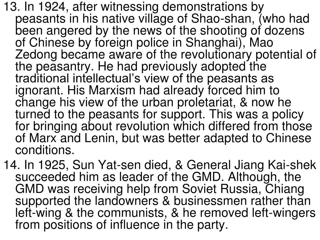 13. In 1924, after witnessing demonstrations by peasants in his native village of Shao-shan, (who had been angered by the news of the shooting of dozens of Chinese by foreign police in Shanghai), Mao Zedong became aware of the revolutionary potential of the peasantry. He had previously adopted the traditional intellectual’s view of the peasants as ignorant. His Marxism had already forced him to change his view of the urban proletariat, & now he turned to the peasants for support. This was a policy for bringing about revolution which differed from those of Marx and Lenin, but was better adapted to Chinese conditions. 14. In 1925, Sun Yat-sen died, & General Jiang Kai-shek succeeded him as leader of the GMD. Although, the GMD was receiving help from Soviet Russia, Chiang supported the landowners & businessmen rather than left-wing & the communists, & he removed left-wingers from positions of influence in the party.