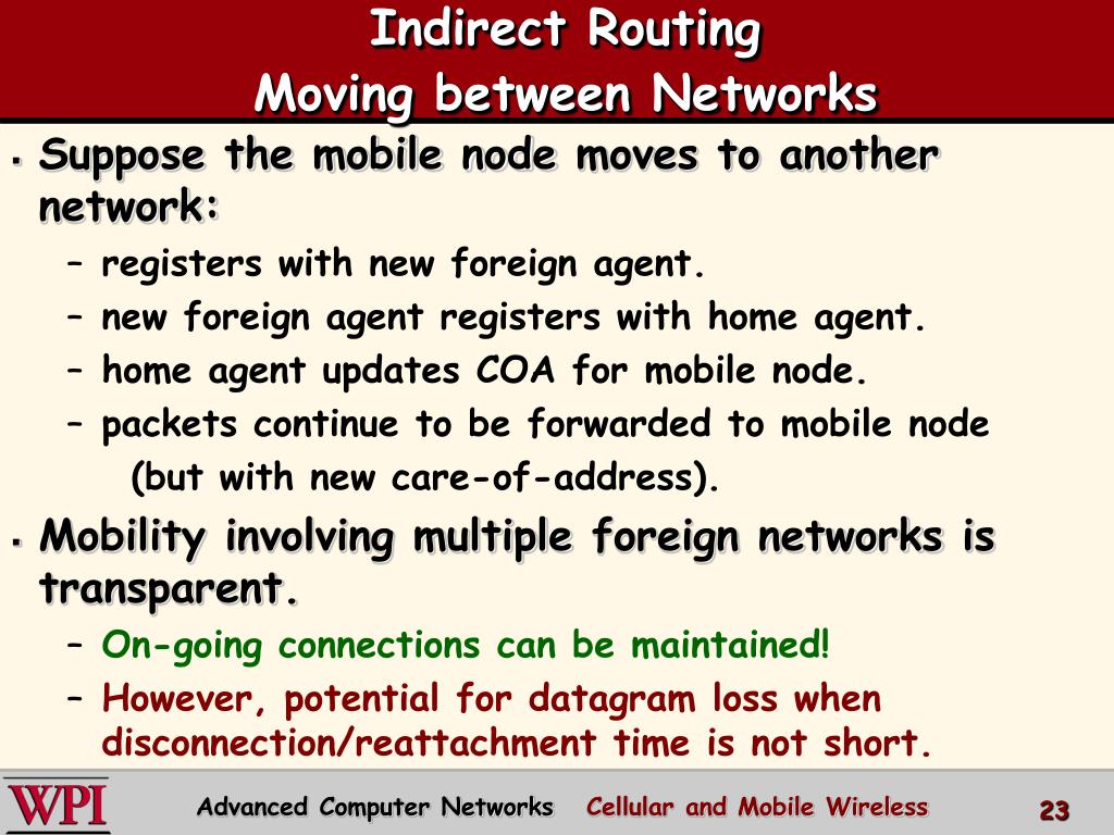Indirect RoutingMoving between Networks • Suppose the mobile node moves to another network: • registers with new foreign agent. • new foreign agent registers with home agent. • home agent updates COA for mobile node. • packets continue to be forwarded to mobile node (but with new care-of-address). • Mobilityinvolving multiple foreign networks is transparent. • On-going connections can be maintained! • However, potential for datagram loss when disconnection/reattachment time is not short. Advanced Computer Networks Cellular and Mobile Wireless