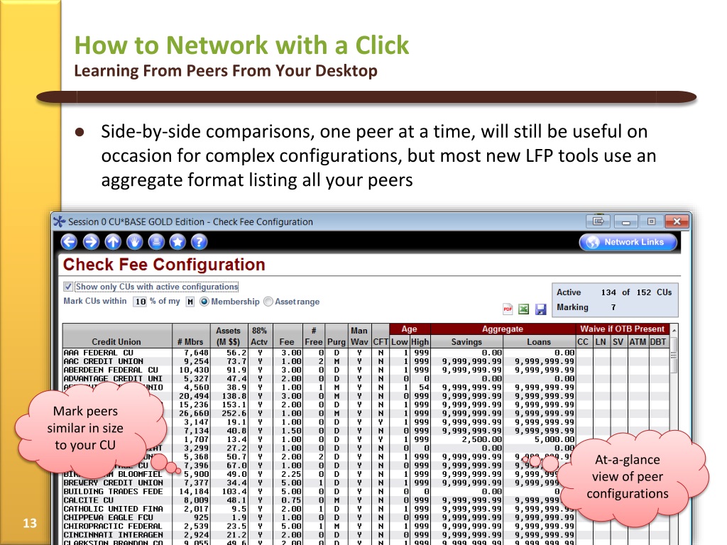 How to Network with a ClickLearning From Peers From Your Desktop • Side-by-side comparisons, one peer at a time, will still be useful on occasion for complex configurations, but most new LFP tools use an aggregate format listing all your peers Mark peers similar in size to your CU At-a-glance view of peer configurations