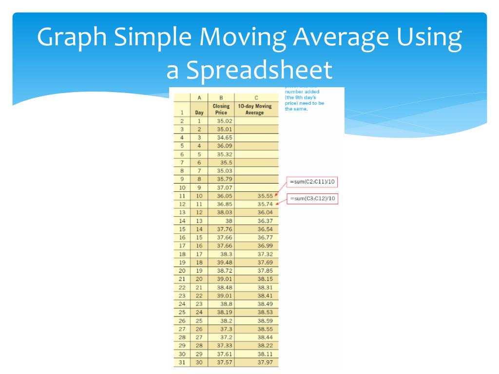 Example 3 • Use a spreadsheet to calculate the 5-day SMA of the closing prices for 10 consecutive trading days. • Add column D to the spreadsheet to calculate the 3-day SMA. In what cell do you start? What formula do you use?