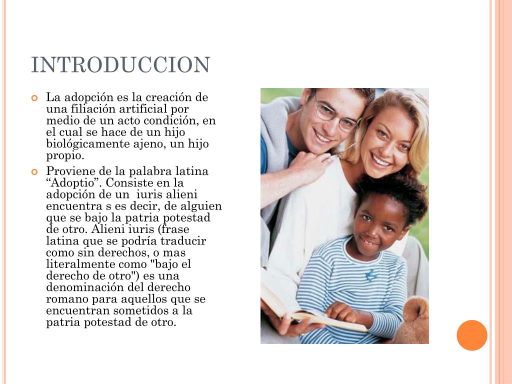 INTRODUCCION • La adopción es la creación de una filiación artificial por medio de un acto condición, en el cual se hace de un hijo biológicamente ajeno, un hijo propio. • Proviene de la palabra latina “Adoptio”. Consiste en la adopción de un iuris alieni encuentra s es decir, de alguien que se bajo la patria potestad de otro. Alieni iuris (frase latina que se podría traducir como sin derechos, o mas literalmente como "bajo el derecho de otro") es una denominación del derecho romano para aquellos que se encuentran sometidos a la patria potestad de otro.