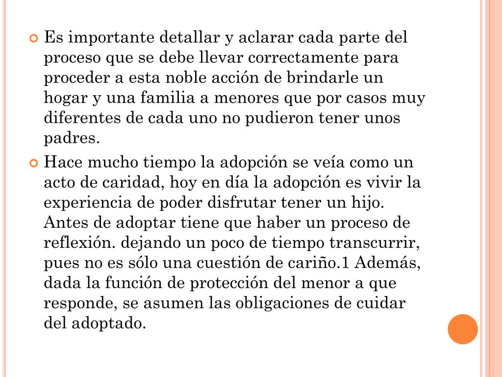 Es importante detallar y aclarar cada parte del proceso que se debe llevar correctamente para proceder a esta noble acción de brindarle un hogar y una familia a menores que por casos muy diferentes de cada uno no pudieron tener unos padres. • Hace mucho tiempo la adopción se veía como un acto de caridad, hoy en día la adopción es vivir la experiencia de poder disfrutar tener un hijo. Antes de adoptar tiene que haber un proceso de reflexión.dejando un poco de tiempo transcurrir, pues no es sólo una cuestión de cariño.1 Además, dada la función de protección del menor a que responde, se asumen las obligaciones de cuidar del adoptado.