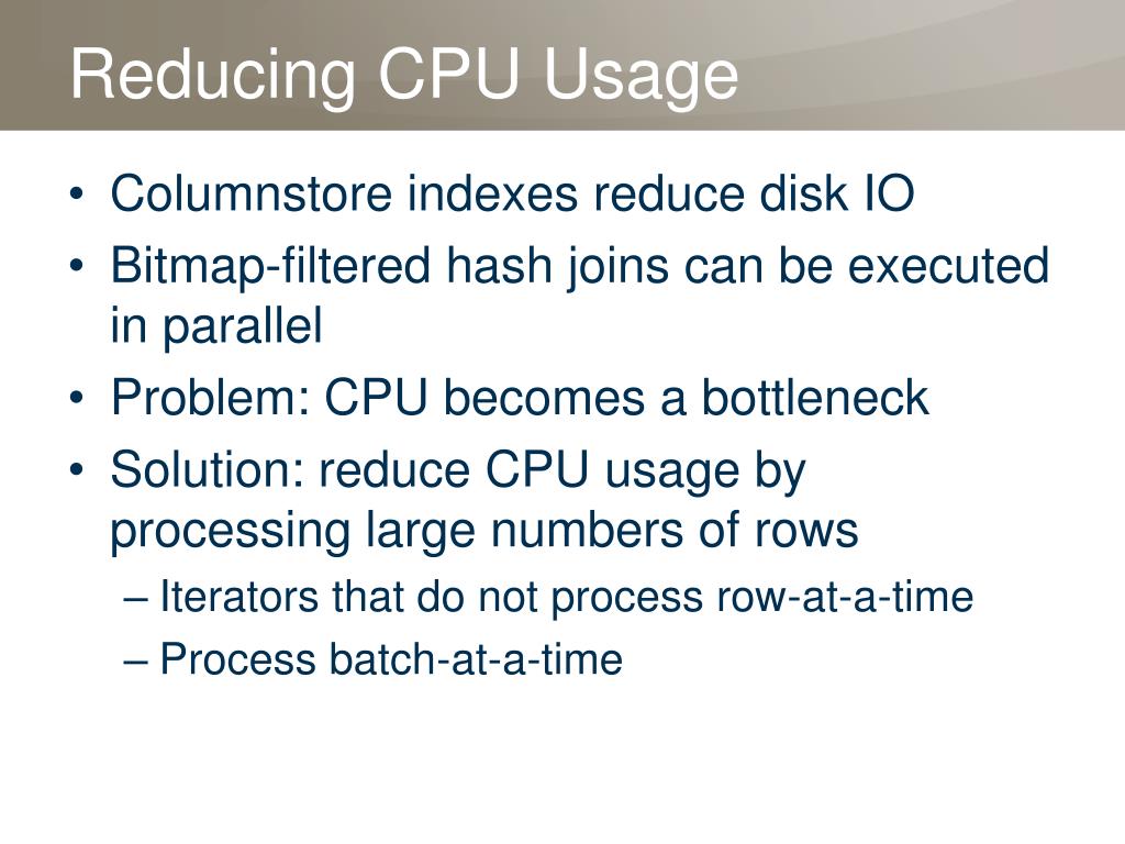 Reducing CPU Usage • Columnstore indexes reduce disk IO • Bitmap-filtered hash joins can be executed in parallel • Problem: CPU becomes a bottleneck • Solution: reduce CPU usage by processing large numbers of rows • Iterators that do not process row-at-a-time • Process batch-at-a-time