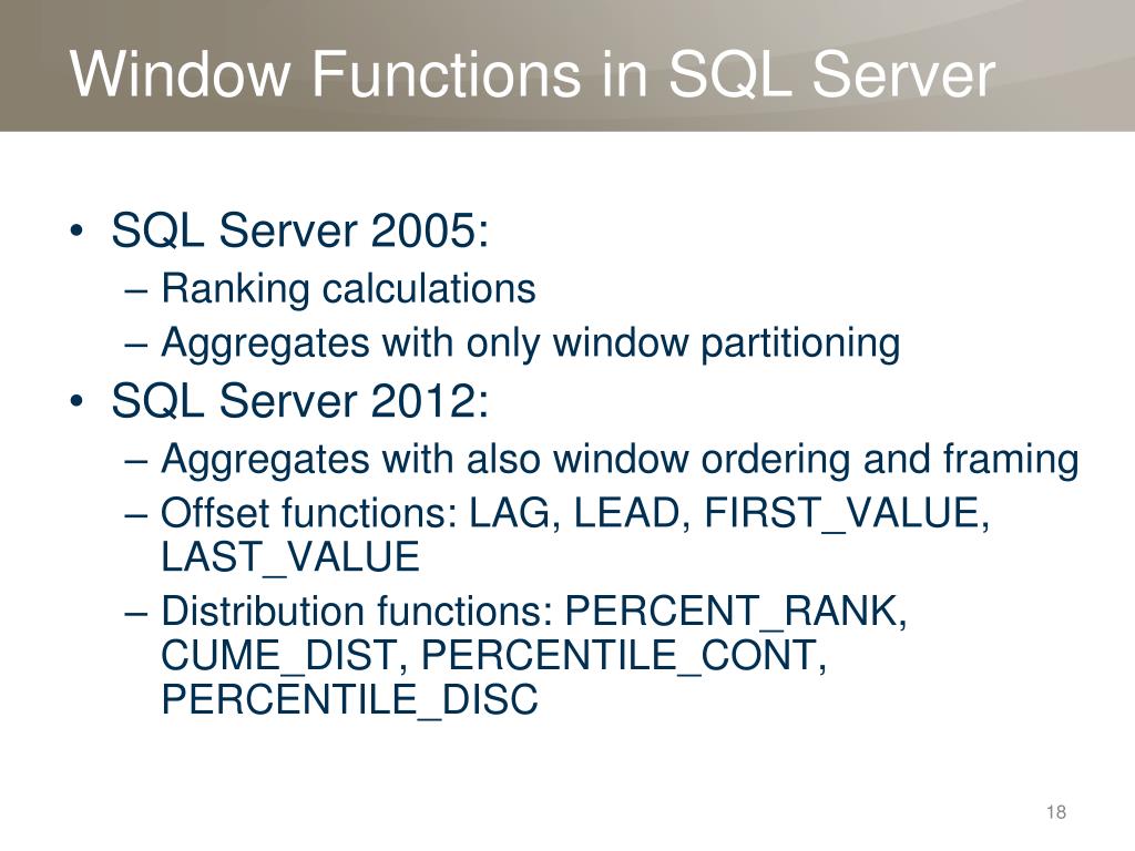 Window Functions in SQL Server • SQL Server 2005: • Ranking calculations • Aggregates with only window partitioning • SQL Server 2012: • Aggregates with also window ordering and framing • Offset functions: LAG, LEAD, FIRST_VALUE, LAST_VALUE • Distribution functions: PERCENT_RANK, CUME_DIST, PERCENTILE_CONT, PERCENTILE_DISC