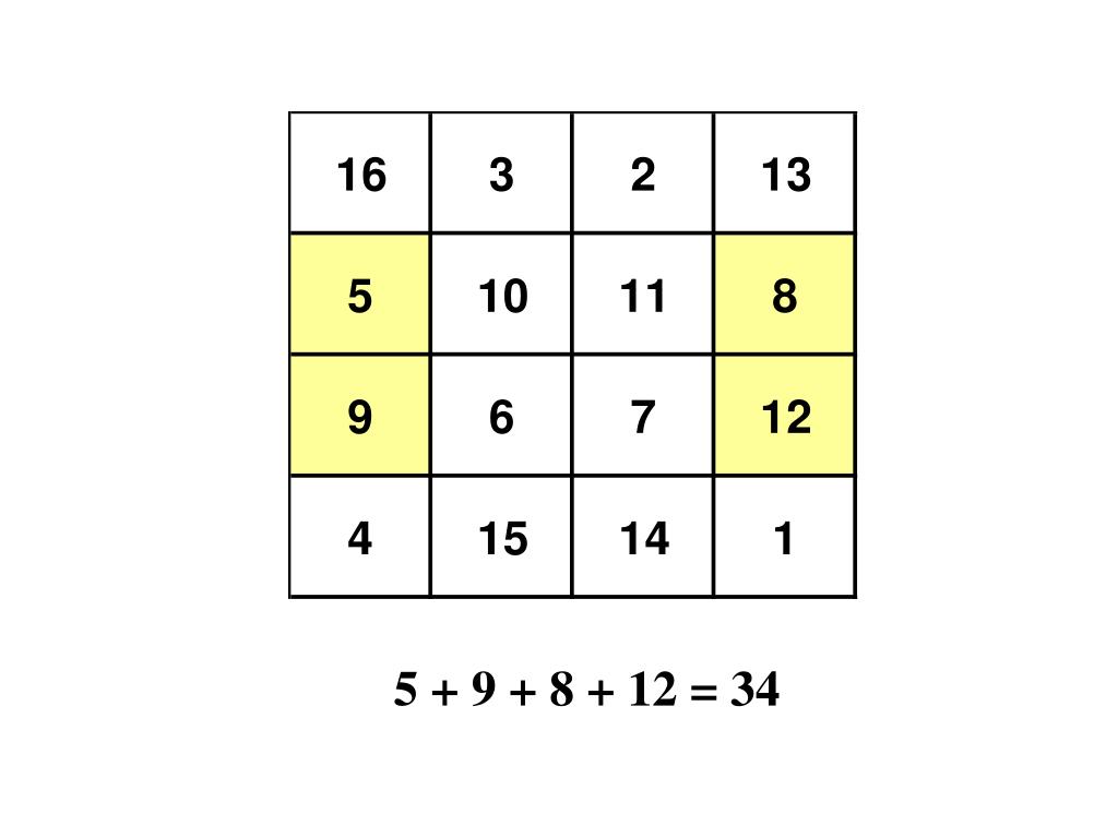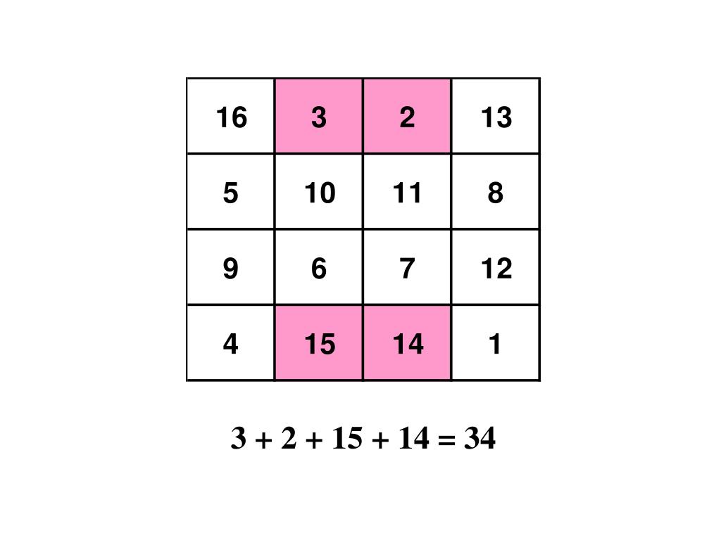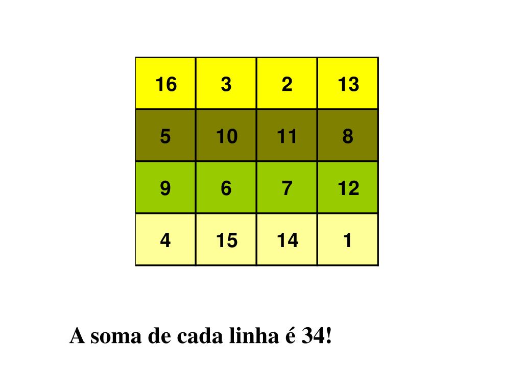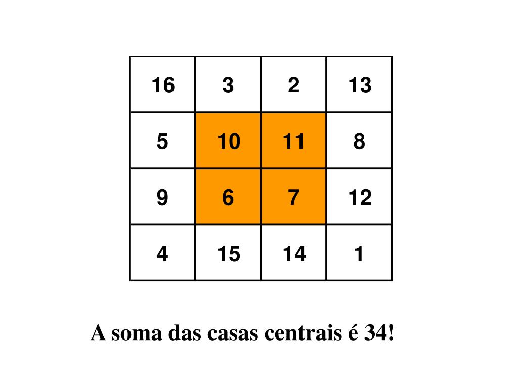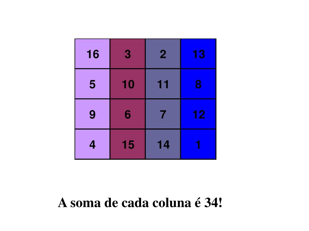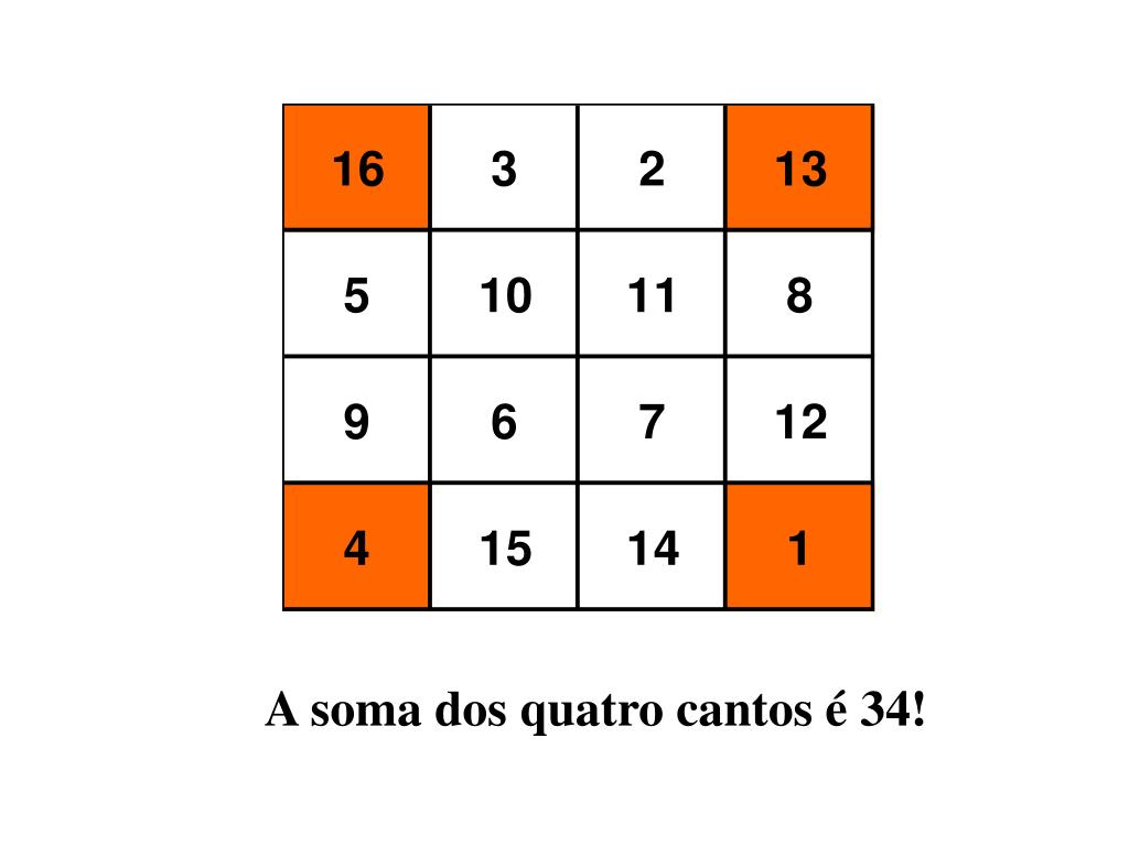 Eis o seu aspecto. E o que tem ele de mágico? O número 34! Este número é a soma de diferentes casas do quadrado.