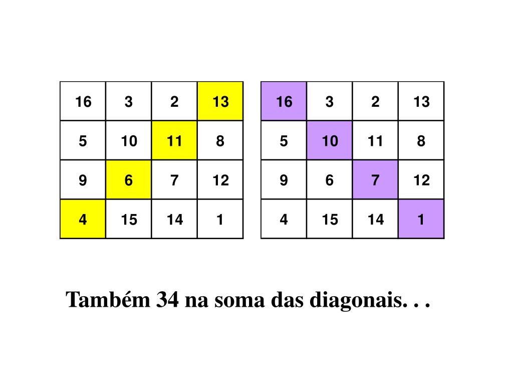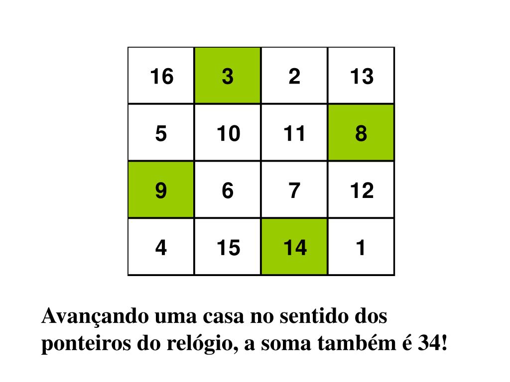 Avançando mais uma casa no mesmo sentido, a soma continua a ser 34!