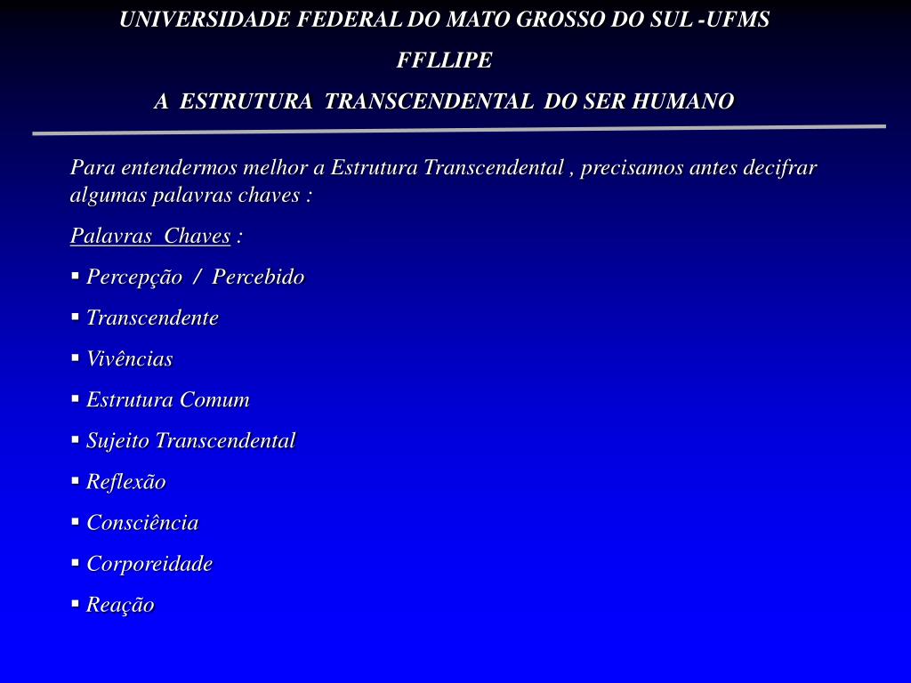 UNIVERSIDADE FEDERAL DO MATO GROSSO DO SUL -UFMS FFLLIPE A ESTRUTURA TRANSCENDENTAL DO SER HUMANO Para entendermos melhor a Estrutura Transcendental , precisamos antes decifrar algumas palavras chaves : Palavras Chaves : • Percepção / Percebido • Transcendente • Vivências • Estrutura Comum • Sujeito Transcendental • Reflexão • Consciência • Corporeidade • Reação