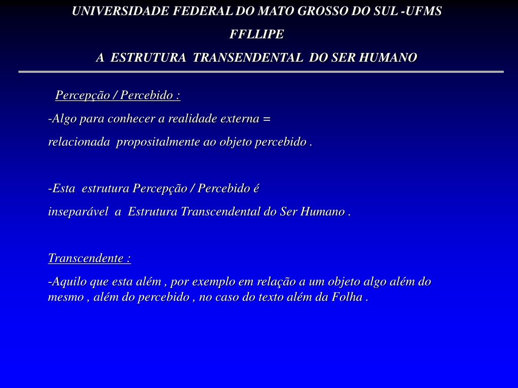 UNIVERSIDADE FEDERAL DO MATO GROSSO DO SUL -UFMS FFLLIPE A ESTRUTURA TRANSENDENTAL DO SER HUMANO Percepção / Percebido : • Algo para conhecer a realidade externa = • relacionada propositalmente ao objeto percebido . • Esta estrutura Percepção / Percebido é • inseparável a Estrutura Transcendental do Ser Humano . • Transcendente : • Aquilo que esta além , por exemplo em relação a um objeto algo além do mesmo , além do percebido , no caso do texto além da Folha .