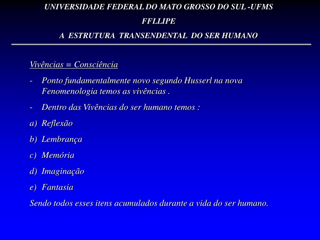 UNIVERSIDADE FEDERAL DO MATO GROSSO DO SUL -UFMS FFLLIPE A ESTRUTURA TRANSENDENTAL DO SER HUMANO Vivências = Consciência • Ponto fundamentalmente novo segundo Husserl na nova Fenomenologia temos as vivências . • Dentro das Vivências do ser humano temos : • Reflexão • Lembrança • Memória • Imaginação • Fantasia • Sendo todos esses itens acumulados durante a vida do ser humano.