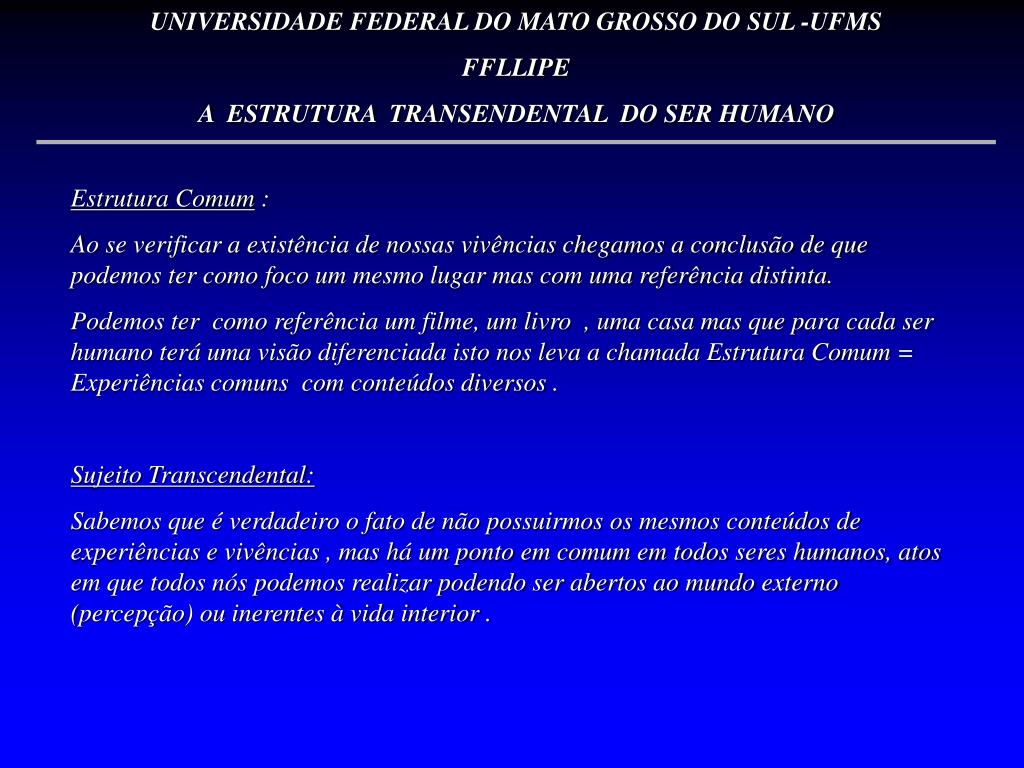UNIVERSIDADE FEDERAL DO MATO GROSSO DO SUL -UFMS FFLLIPE A ESTRUTURA TRANSENDENTAL DO SER HUMANO Estrutura Comum : Ao se verificar a existência de nossas vivências chegamos a conclusão de que podemos ter como foco um mesmo lugar mas com uma referência distinta. Podemos ter como referência um filme, um livro , uma casa mas que para cada ser humano terá uma visão diferenciada isto nos leva a chamada Estrutura Comum = Experiências comuns com conteúdos diversos . Sujeito Transcendental: Sabemos que é verdadeiro o fato de não possuirmos os mesmos conteúdos de experiências e vivências , mas há um ponto em comum em todos seres humanos, atos em que todos nós podemos realizar podendo ser abertos ao mundo externo (percepção) ou inerentes à vida interior .