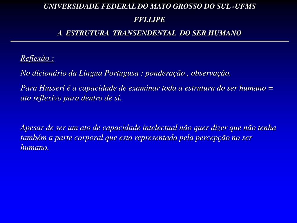 UNIVERSIDADE FEDERAL DO MATO GROSSO DO SUL -UFMS FFLLIPE A ESTRUTURA TRANSENDENTAL DO SER HUMANO Reflexão : No dicionário da Lingua Portugusa : ponderação , observação. Para Husserl é a capacidade de examinar toda a estrutura do ser humano = ato reflexivo para dentro de si. Apesar de ser um ato de capacidade intelectual não quer dizer que não tenha também a parte corporal que esta representada pela percepção no ser humano.
