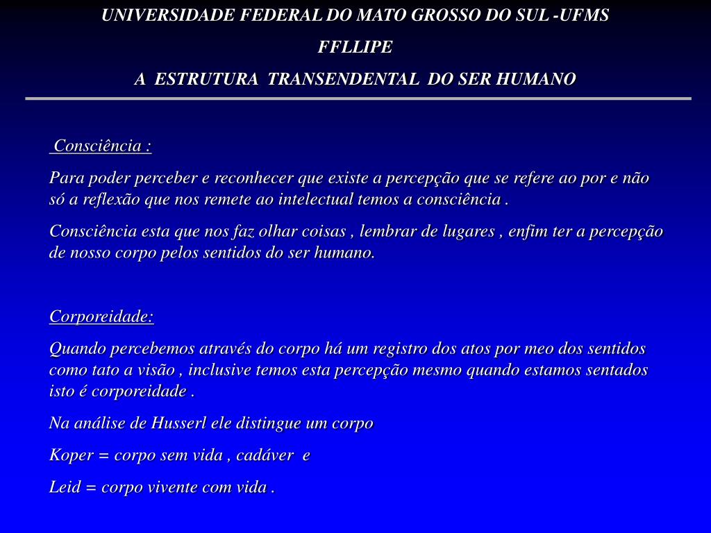 UNIVERSIDADE FEDERAL DO MATO GROSSO DO SUL -UFMS FFLLIPE A ESTRUTURA TRANSENDENTAL DO SER HUMANO Consciência : Para poder perceber e reconhecer que existe a percepção que se refere ao por e não só a reflexão que nos remete ao intelectual temos a consciência . Consciência esta que nos faz olhar coisas , lembrar de lugares , enfim ter a percepção de nosso corpo pelos sentidos do ser humano. Corporeidade: Quando percebemos através do corpo há um registro dos atos por meo dos sentidos como tato a visão , inclusive temos esta percepção mesmo quando estamos sentados isto é corporeidade . Na análise de Husserl ele distingue um corpo Koper = corpo sem vida , cadáver e Leid = corpo vivente com vida .