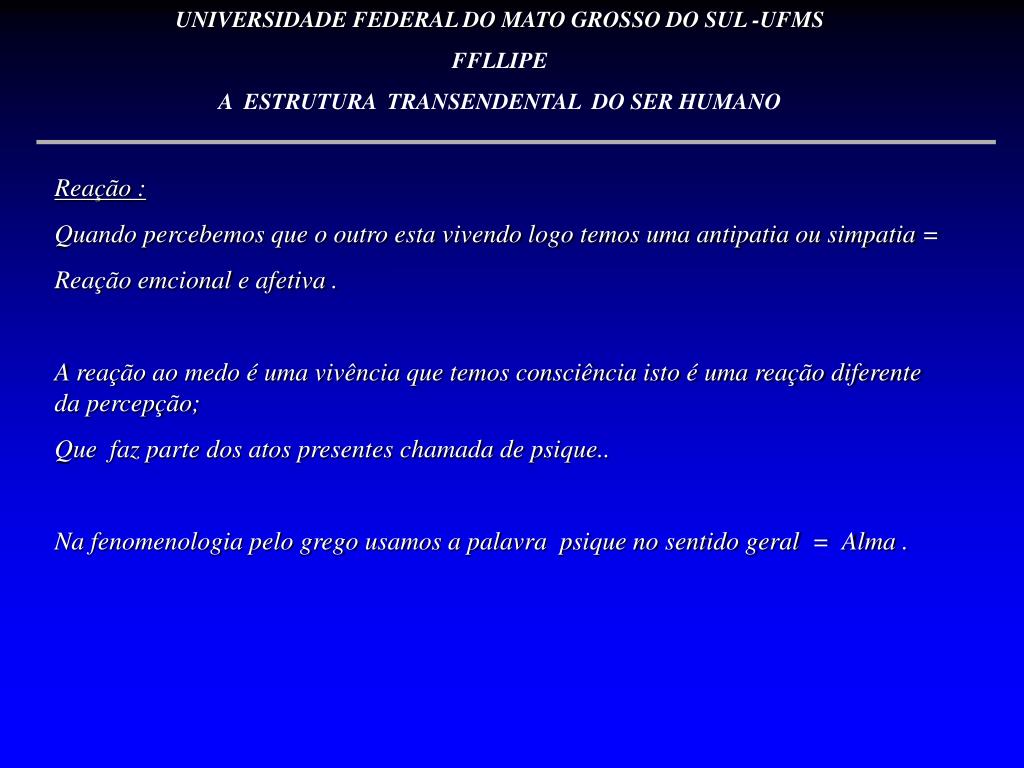 UNIVERSIDADE FEDERAL DO MATO GROSSO DO SUL -UFMS FFLLIPE A ESTRUTURA TRANSENDENTAL DO SER HUMANO Reação : Quando percebemos que o outro esta vivendo logo temos uma antipatia ou simpatia = Reação emcional e afetiva . A reação ao medo é uma vivência que temos consciência isto é uma reação diferente da percepção; Que faz parte dos atos presentes chamada de psique.. Na fenomenologia pelo grego usamos a palavra psique no sentido geral = Alma .