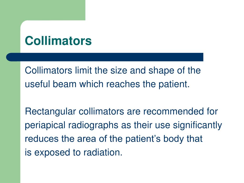 Collimators Collimators limit the size and shape of the useful beam which reaches the patient. Rectangular collimators are recommended for periapical radiographs as their use significantly reduces the area of the patient’s body that is exposed to radiation.