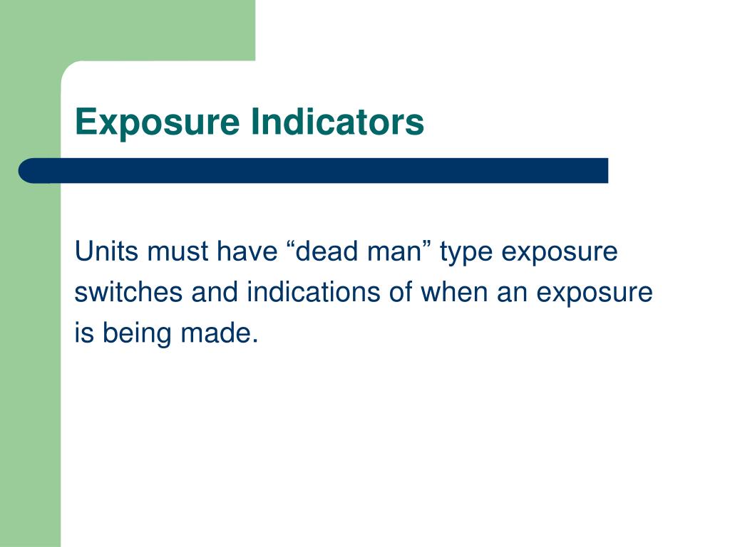 Exposure Indicators Units must have “dead man” type exposure switches and indications of when an exposure is being made.