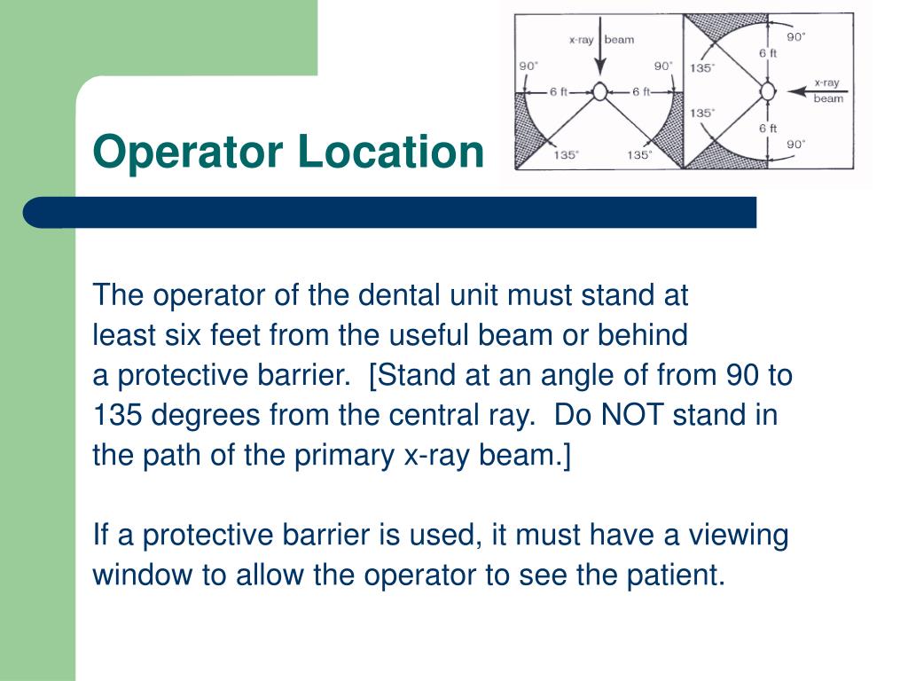 Operator Location The operator of the dental unit must stand at least six feet from the useful beam or behind a protective barrier. [Stand at an angle of from 90 to 135 degrees from the central ray. Do NOT stand in the path of the primary x-ray beam.] If a protective barrier is used, it must have a viewing window to allow the operator to see the patient.