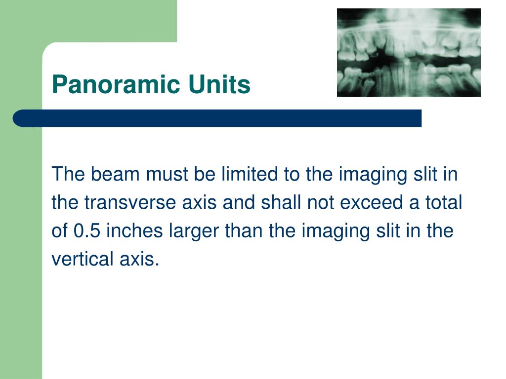 Panoramic Units The beam must be limited to the imaging slit in the transverse axis and shall not exceed a total of 0.5 inches larger than the imaging slit in the vertical axis.