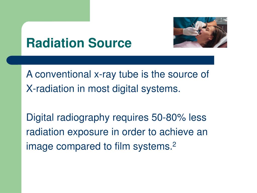 Radiation Source A conventional x-ray tube is the source of X-radiation in most digital systems. Digital radiography requires 50-80% less radiation exposure in order to achieve an image compared to film systems.2